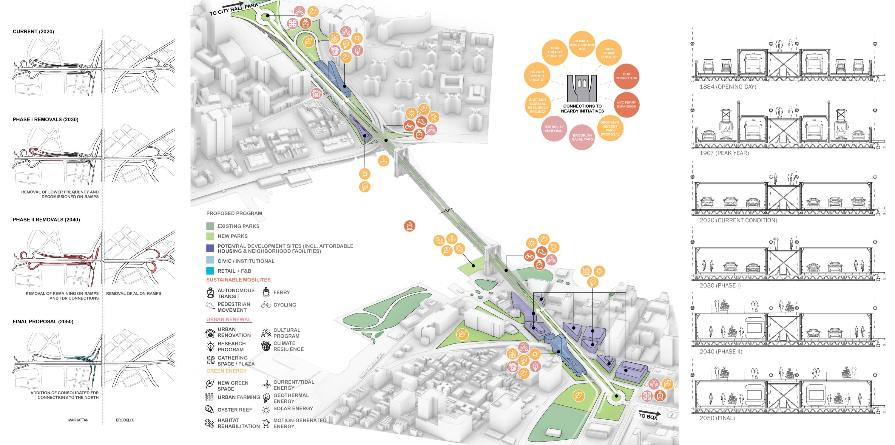 The proposal envisions a future that elevates people over automobiles, reclaims land entangled by roads and ramps for civic use in the form of parks, museums, local commerce, recreation and housing and makes the bridge more accessible to adjacent communities. In the design, the upper deck expansion becomes a planted promenade with lanes for tourists and commuters, while the lower deck features six traffic lanes reduced to two for trolleys and emergency vehicles, with the remainder dedicated to public use, including dedicated bike lanes and planters.