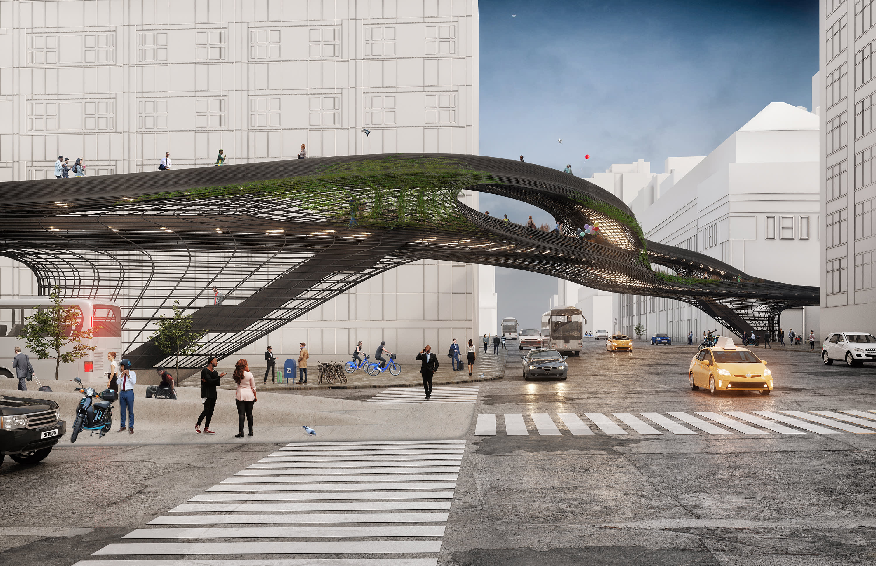Drawing inspiration from the architectural icons it connects, DXA’s design references the historic interlaced steel plate work of the High Line and the intricate steel structure of the original inner concourse of the 1910 Penn Station. The structural steel fabrication also references the 19th century with the structural framing concept of the Statue of Liberty. Today, the curved structural framing can be executed with water jet cut steel and pre-fabrication assembly. The design aims to create a beautifully bending pedestrian path over the busy avenue below.