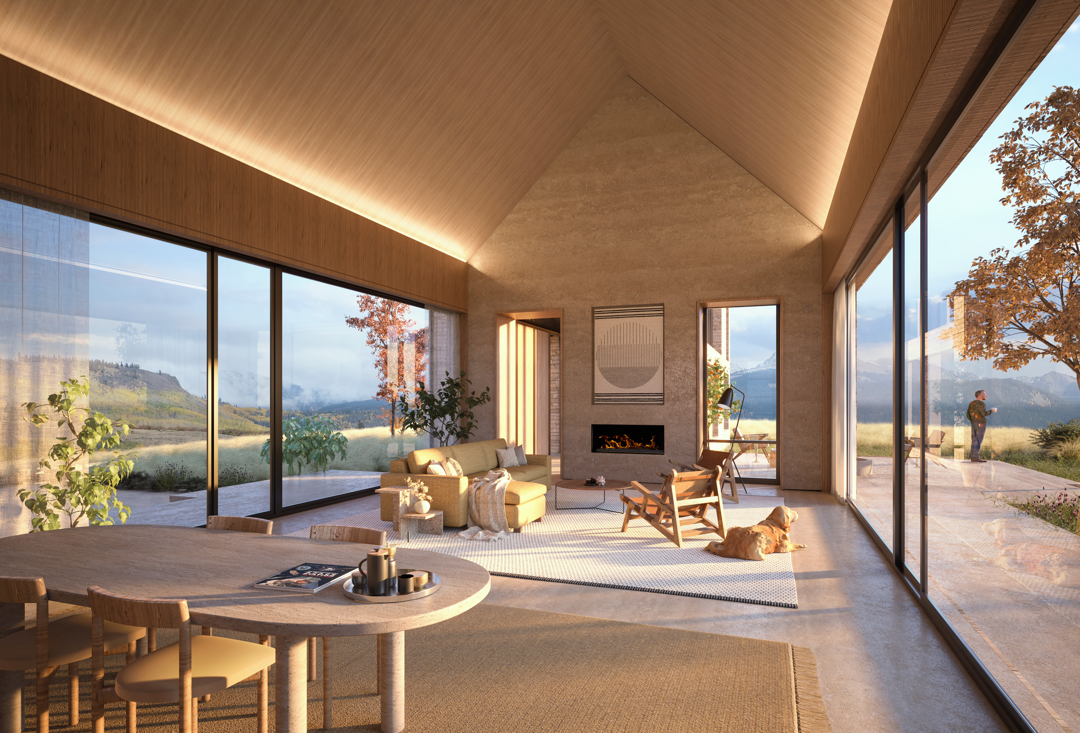 The distributed volumes accentuate the horizontality of the natural plateau on which the house is located. The aggregate of gabled roofs emulate the clustered peaks of the surrounding mountain ranges and the historic outposts of Colorado's early settlement. While contemporary in both nature and the simplicity of its form, the house will feature natural local stone, slate roof shingles, and locally sourced spruce wood siding, providing a rustic and contextual aesthetic, and importantly, one that weathers and evolves over time.