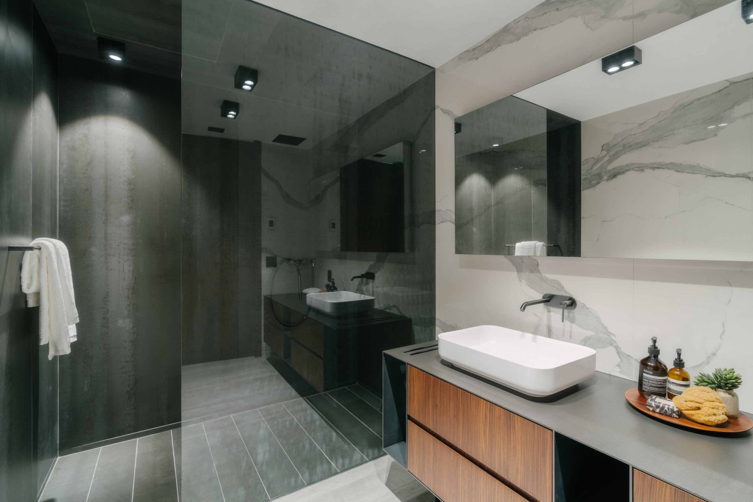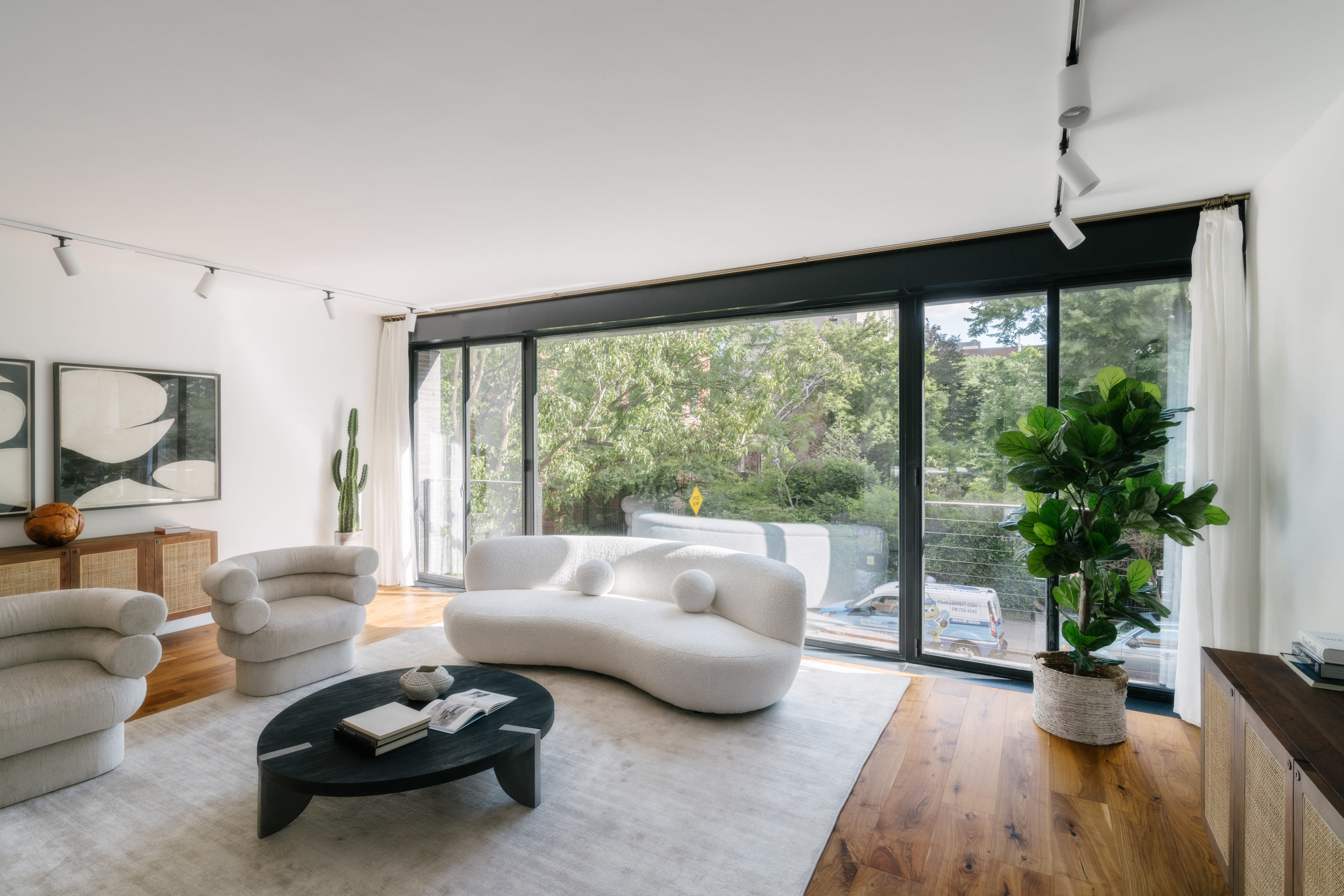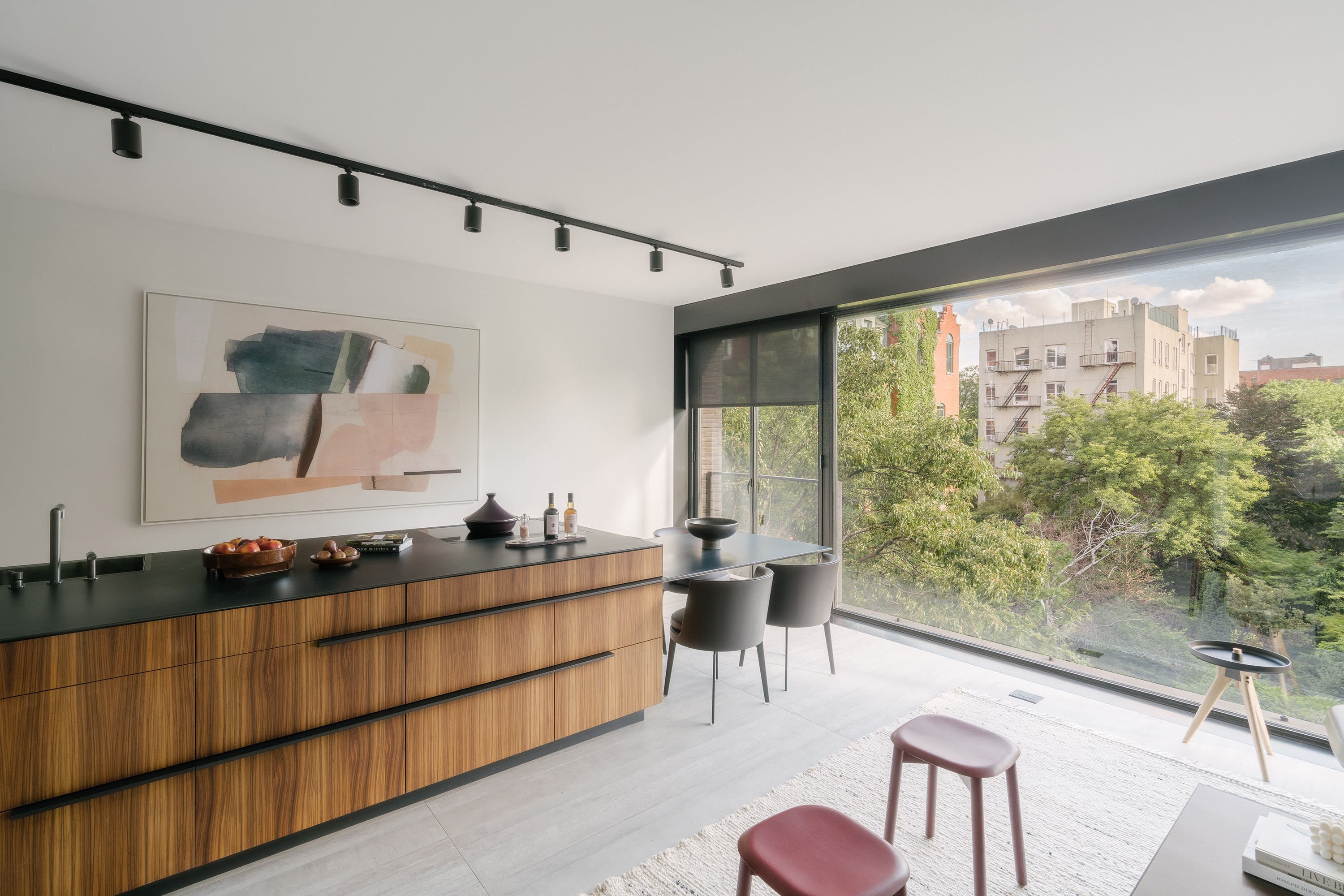 This ground-up building faces an inner-block garden on 6th Street in the East Village. A desire for full expanses of glass to view the garden and the skyline beyond presented a challenge with the heat gain associated with direct southern exposure. The facade is clad in a Danish hand-made brick and includes a full width mural along a sidewall that links the building in character with its East Village neighbors where street art abounds. The five residential units, from a small studio up to a dramatic three bedroom with office and double height duplex on the top floors, incorporate a simple and timeless palette of materials throughout.