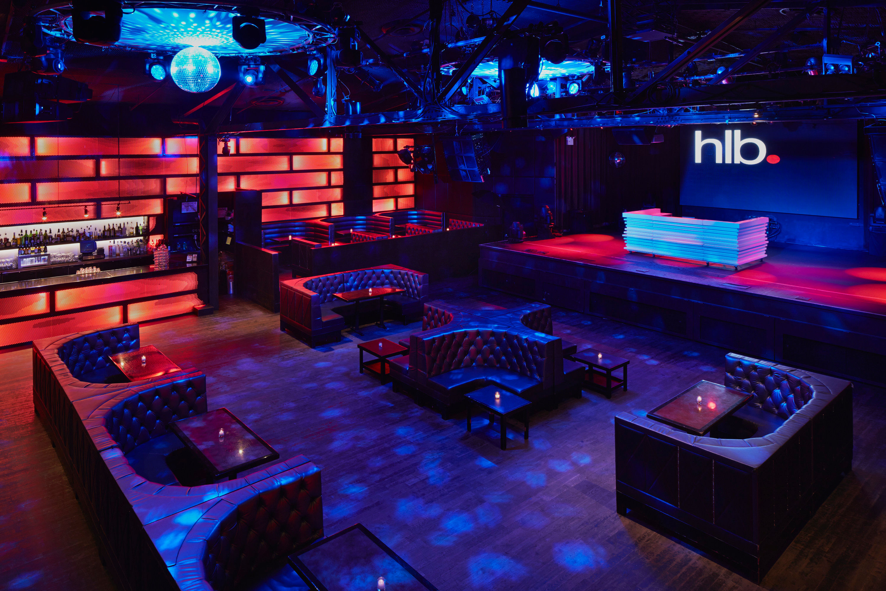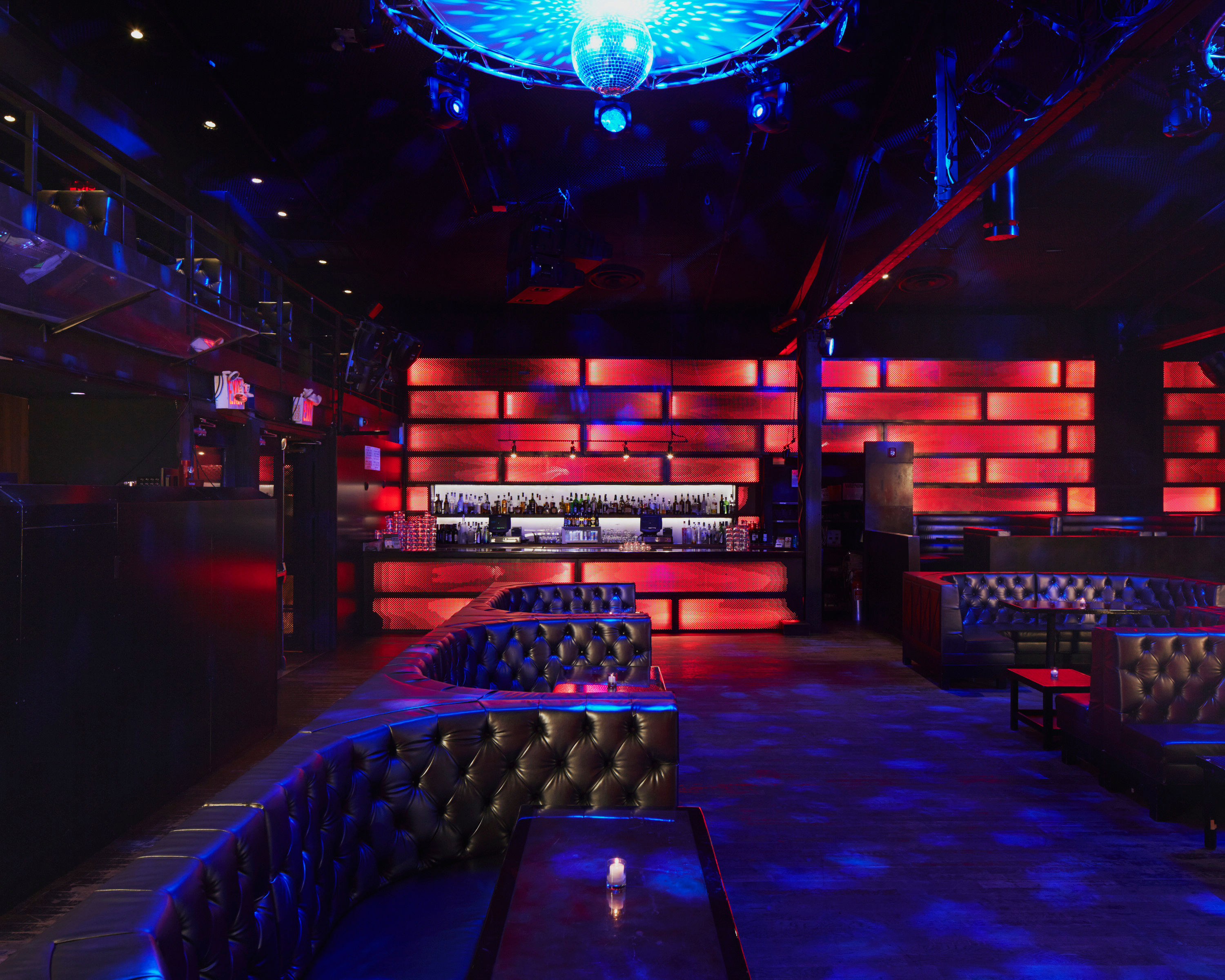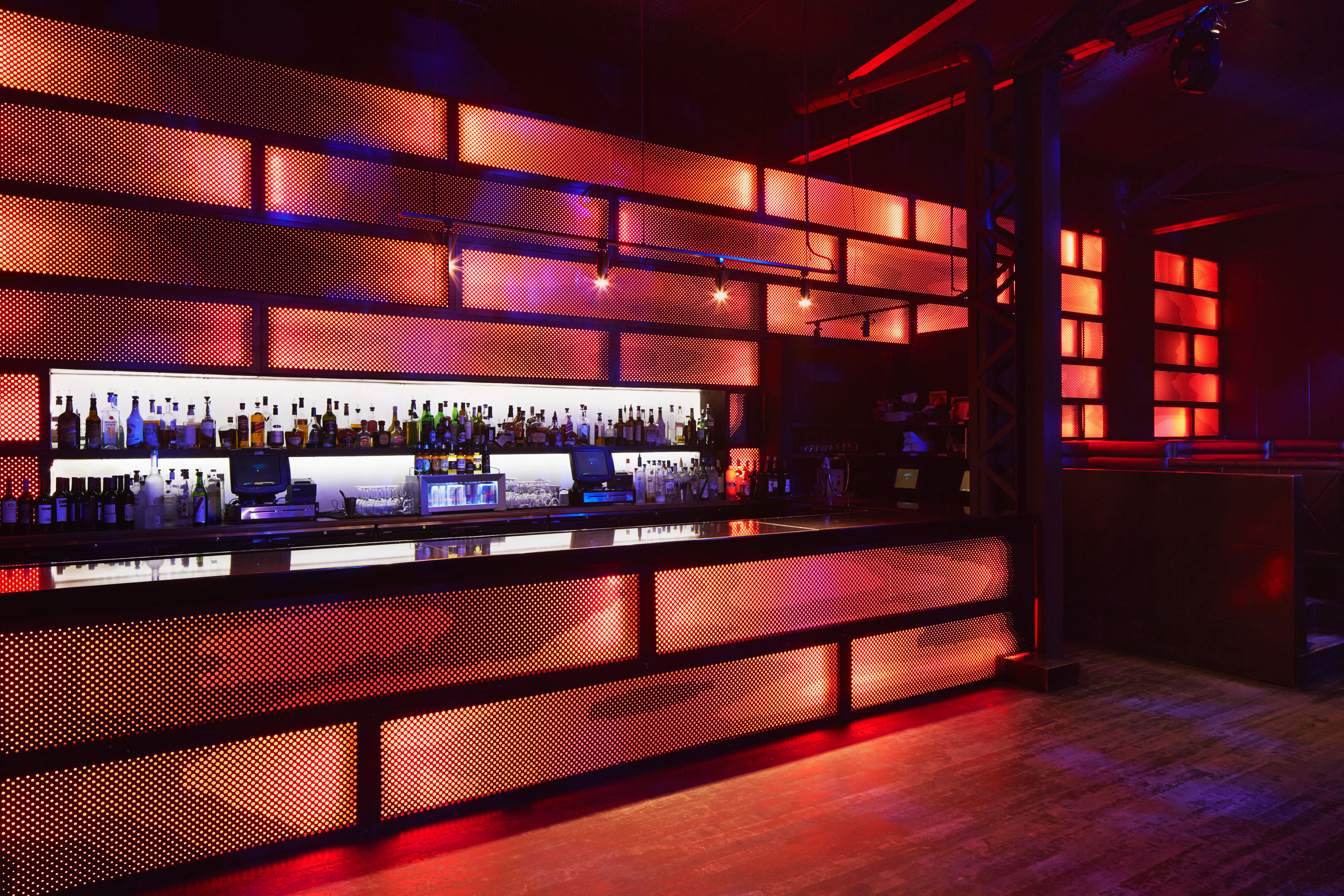 The interior features perforated metal and planks that continue in a horizontal pattern that wraps all wall surfaces of the public portions of the lobby and the bar backdrops inside the club. The metal panel is suspended in front of mirrors with interstitial lighting to create a dazzling pattern of offset perforations and reflections.