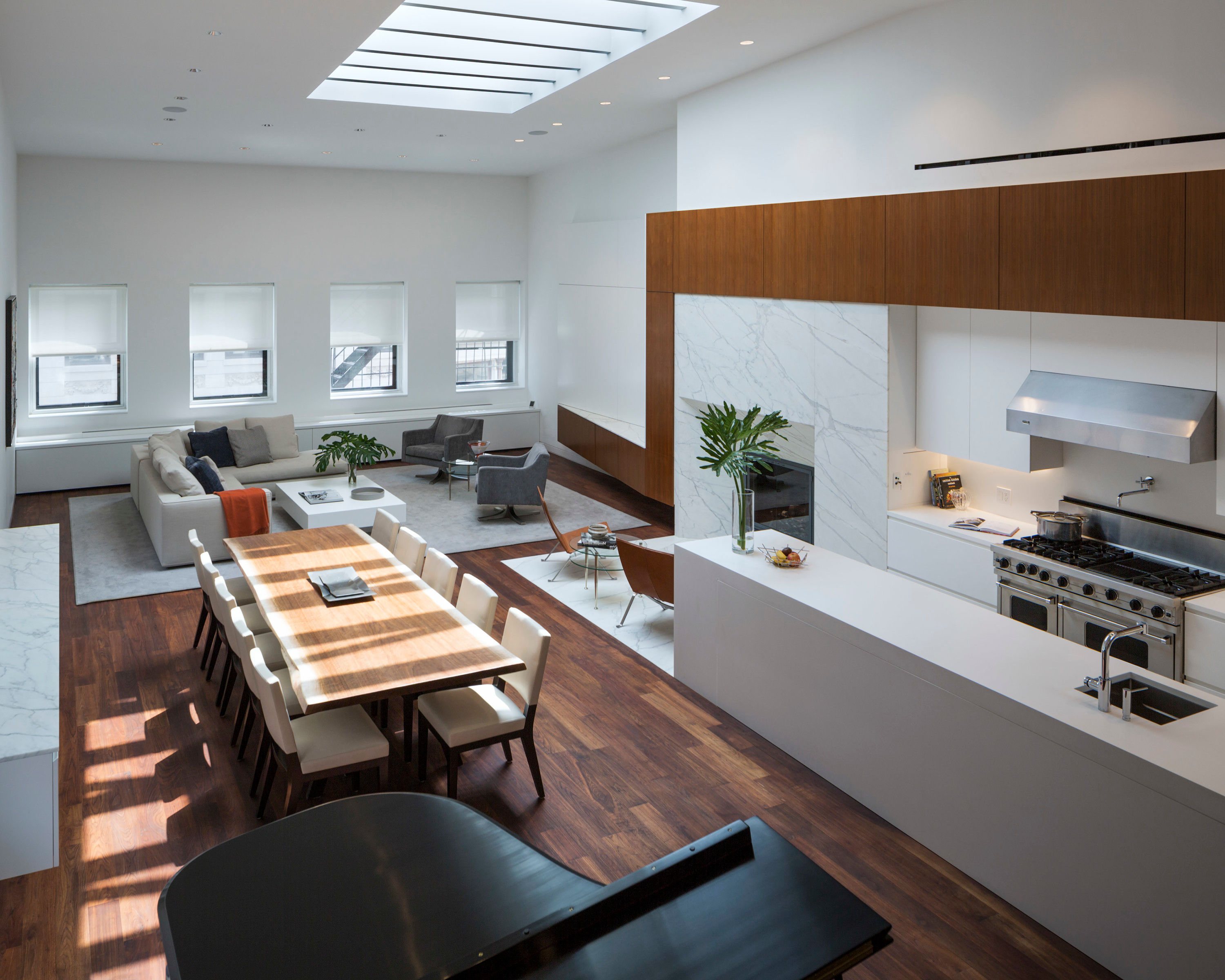 A sixteen foot long Corian kitchen island, white marble fireplace surround and walnut wood clad wall integrating storage, media and pantry functions, runs the length of the loft-like upper floor. A zinc-clad bulkhead and central skylight serve to bathe the shared living and