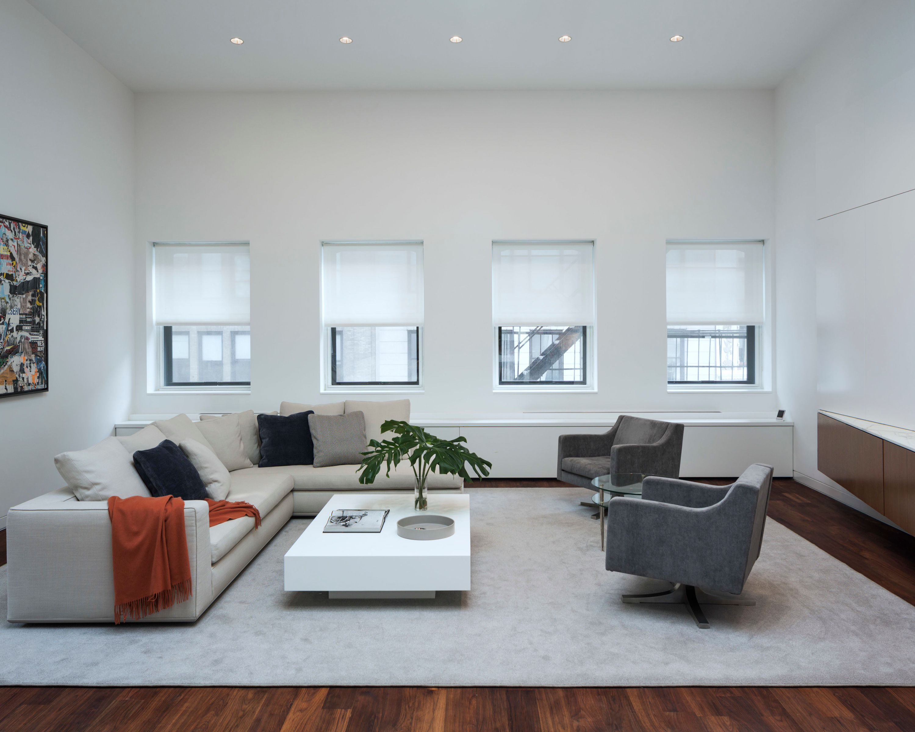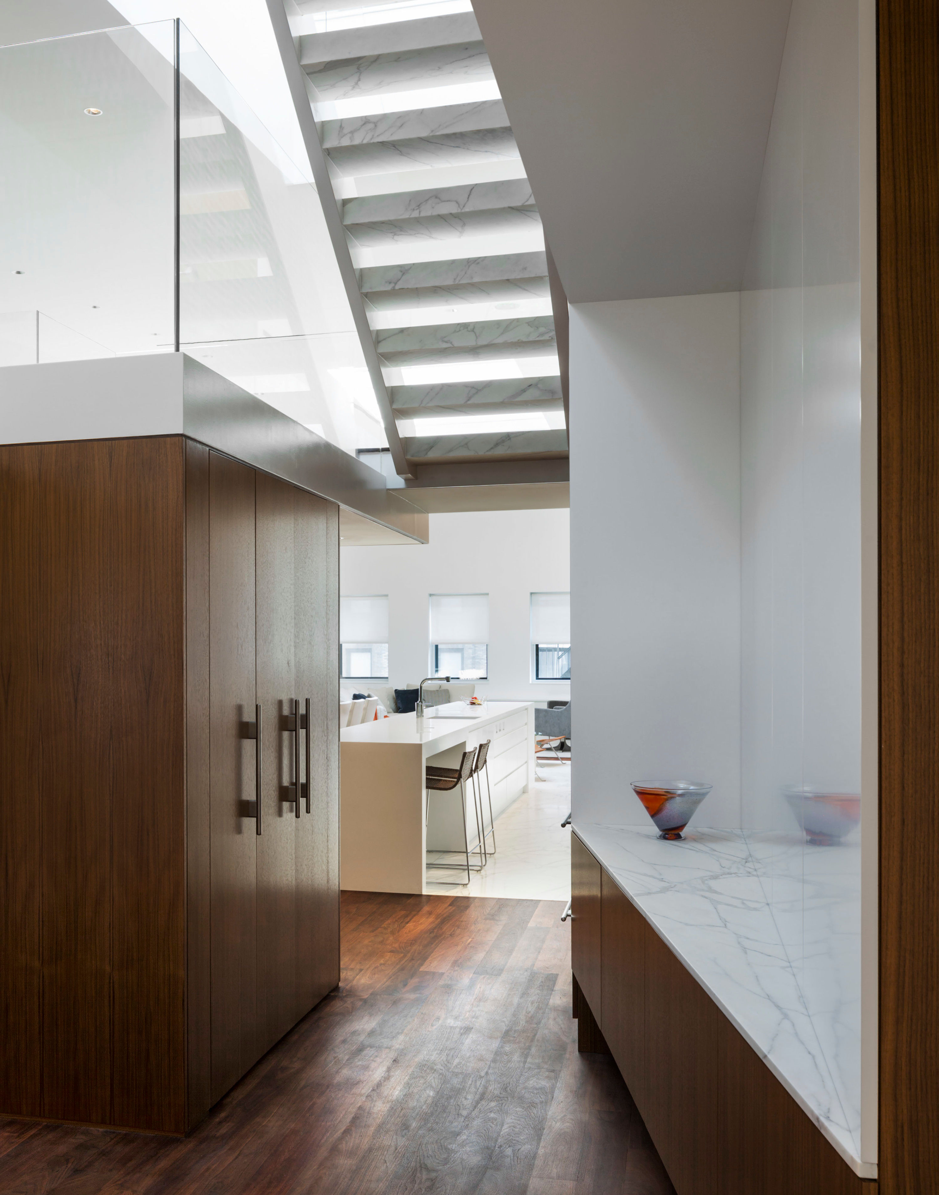 This five-bedroom, four-bath, duplex penthouse renovation features a new open-riser marble and glass stair connecting two levels to a mezzanine and roof garden.